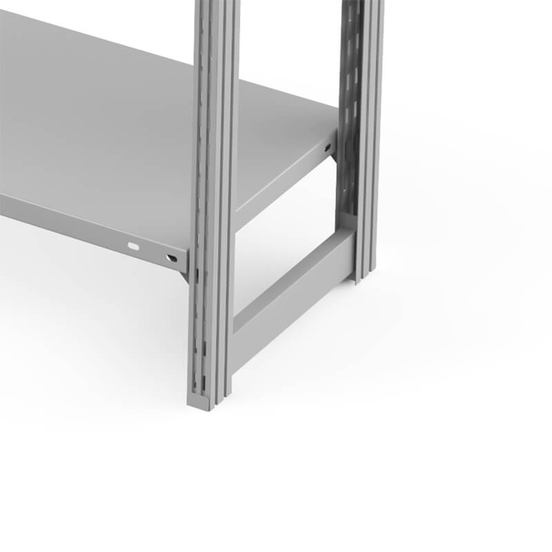 Стеллаж комплектуется сплошными металлическими полками, покрыт порошковой полимерной краской светло-серого цвета (RAL 7035).