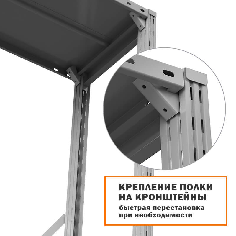 - Быстрая сборка без инструментов. Полностью безболтовое крепление не требует использования специальных инструментов и позволяет легко собрать стеллаж за несколько минут: все составные элементы и полки крепятся на кронштейны;